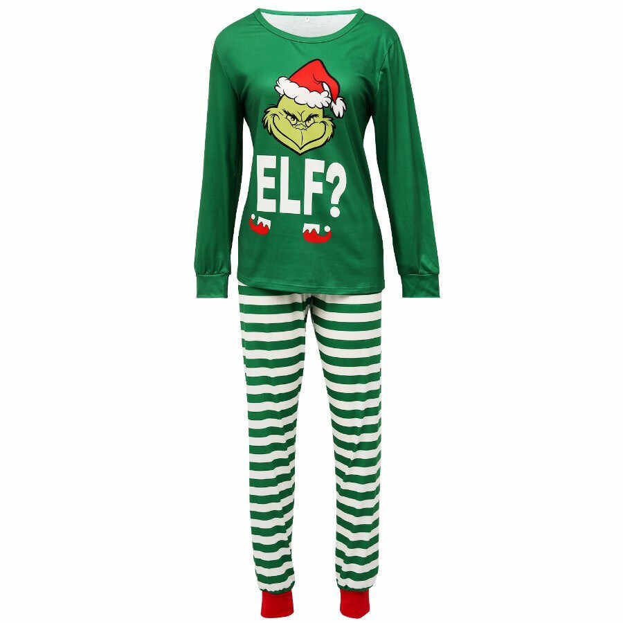 Grinch Christmas Round Neck Green Striped Cartoon Print Family Pajamas Set