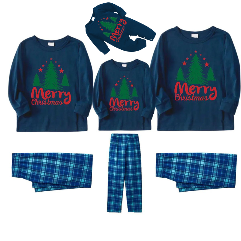 Enjoy the holiday season with our Merry Christmas Letter & Tree Printed Family Matching Pajamas. This set features a blue long sleeve top adorned with a festive "Merry Christmas" and tree pattern. paired with blue and white plaid pants. Perfect for festive family gatherings and holiday photos. these pajamas offer comfort and style for all ages.