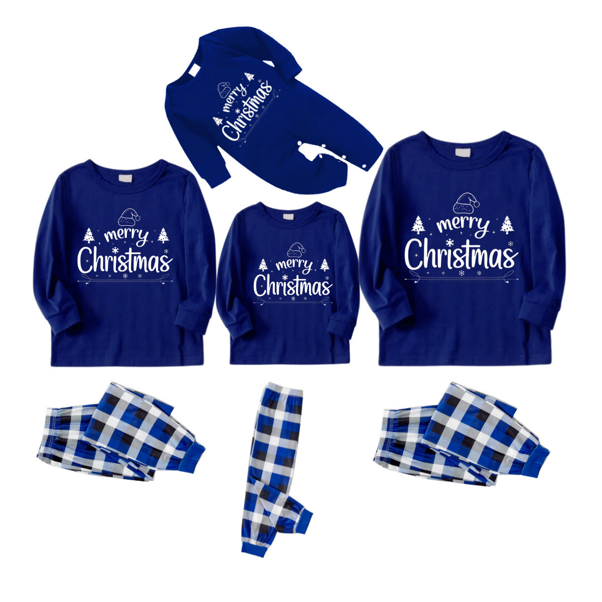 "Merry Christmas" Text Printed Blue and White Plaid Family Matching Pajamas 646793